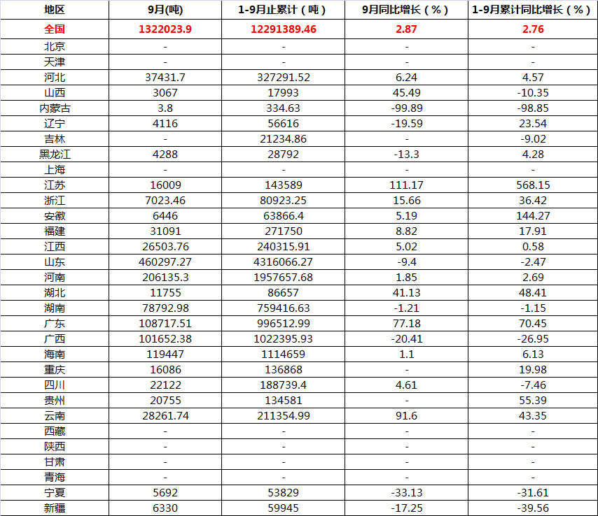 11月12日消息:2015年9月中国纸浆(原生浆及废纸浆)产量为1322023.90吨,同比增加2.87%。2015年1-9月止累计中国纸浆(原生浆及废纸浆)产量12291389.46吨,同比增长2.76%。2015年1-9月全国纸浆(原生浆及废纸浆)数据表如下表所示: