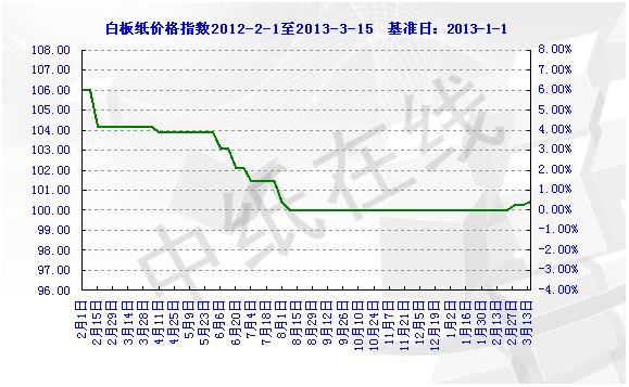 2013年3月15日白板纸价格指数为100.42点,比上周上涨0.17%,较周期内最高点106.02(2012- 5-2)下降了5.60% 。