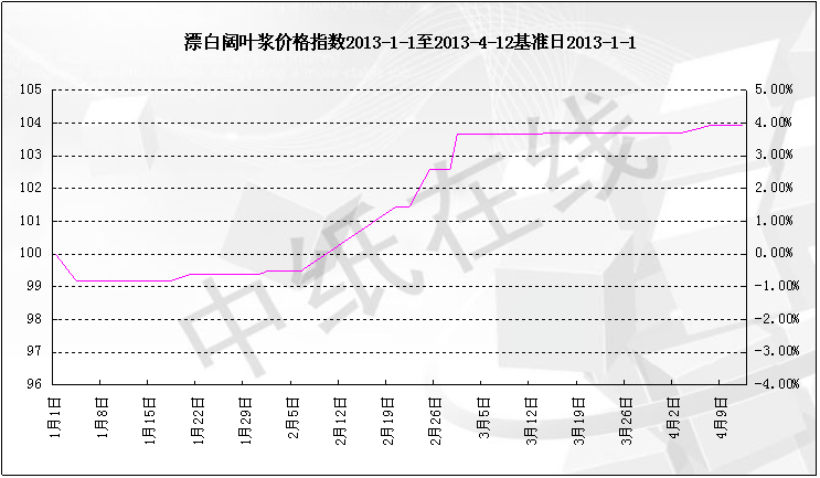 2013年4月12日漂白阔叶浆价格指数为103.92点,与上周持平,目前为周期内最高点即103.92点。