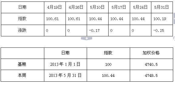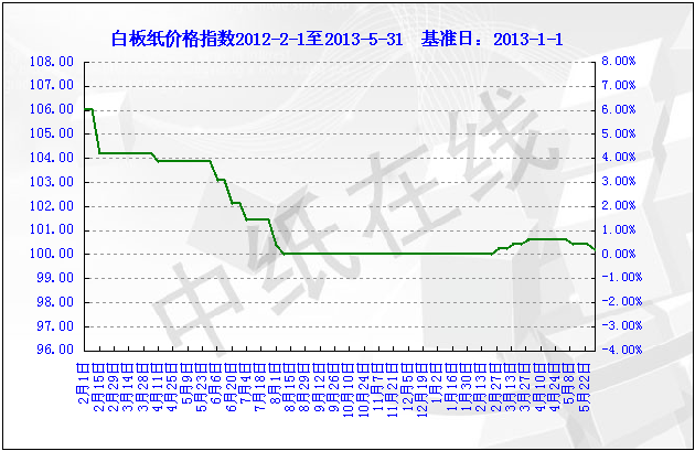 2013年5月31日白板纸价格指数为100.19点,比上周下调0.25,较周期内最高点106.02(2012- 5-2)下降了5.83%。
